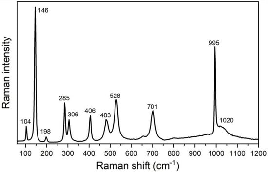 The Raman scattering measurements taken on the catalyst sample have confirmed the results of XRPD regarding orthorhombic α-V2O5 structure with Pmnm symmetry. This structure is associated with 21 Raman active modes (7Ag + 3B1g + 7B2g + 4B3g) [30], 10 of which are registered in the spectrum shown in Figure 5. These modes are unambiguously assigned to α-V2O5 structure [30,31]: ~104(Ag), 146(B1g/B3g), 198 (Ag/B2g), 285 (B1g/B3g), 306 (Ag), 406 (Ag), 483 (Ag), 528 (Ag), 701 (B1g/B2g), and 995 cm−1 (Ag). A good agreement of the position of the Raman mode at 995 cm−1 with corresponding bulk value, together with the absence of ~840 cm−1 mode in the spectra of the catalyst, reveals a good crystallinity of the V2O5 phase [30,31,32]. A broad feature at ~1020 cm−1 may be ascribed to surface VOx species on V2O5 [33].