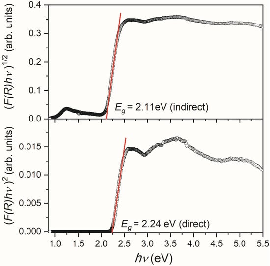 where h is Planck’s constant, ν—photon’s frequency, Eg—bandgap, A—proportional constant, and the n factor depends on the nature of the electron transition. They equal 1/2 or 2 for allowed direct and indirect transition band gaps [36]. The band gap values were deduced by extrapolating the linear portion of the curves to the energy axis, as shown in Figure 6. According to this procedure, the bandgap energy Eg values, assuming the allowed direct and indirect transitions, are estimated as ~2.24 and ~2.11 eV, respectively.