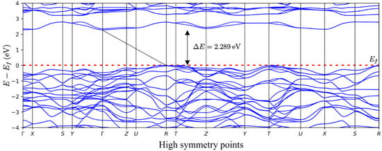 In this work, the DFT approach was used to perform band structure calculations to complement our experimental observations and to compare band gaps. The model of V2O5 was generated according to the previously mentioned information regarding the crystal structure of V2O5. The model of V2O5 was first subjected to geometrical optimization, followed by band structure calculations, using the PBE-D3 level of theory with Hubbard U value set to 3.5 eV for vanadium 3d states, a value reported to produce excellent results in terms of band gap for this material [39]. The obtained band structure is presented in Figure 7.