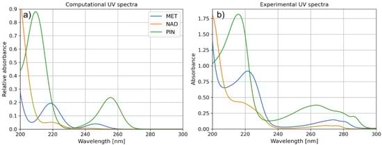 (a) Computational and (b) experimental UV spectra of MET, NAD, and PIN.