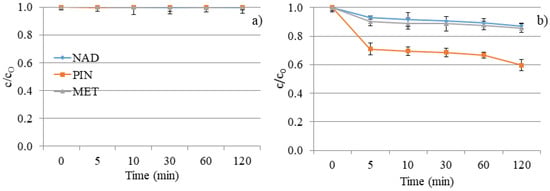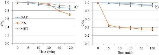 The poor degradation efficiency of investigated compounds was expected, considering the investigated compounds’ absorption maxima and the UV lamp’s characteristics. Namely, the absorption maximum of the used lamp corresponds to the UV/A-B region of the spectrum. As shown in Figure 9a, MET and NAD expressed 10% and 15% degradation after 120 min. DF of separate solutions offers slight removal of NAD and MET and a two- to three-times higher degradation rate for PIN (30%). The nature of the substituents attached to the aromatic ring and the secondary interaction of released ions have significant roles in the degradation progress and regulate the degradation pathways. The obtained results can be explained based on the structural characteristics of the tested compounds.