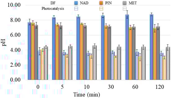 Further, the mixture of NAD, PIN, and MET was subjected to DF and a photocatalytic reaction with V2O5 to study their degradation when coexisting in environmental waters, as it occurs in nature. As seen in Figure 12a, exposure of the NAD, PIN, and MET mixture to UV did not cause a higher degradation efficiency of these three compounds. The DF of the separate solution of each β-blocker was a more efficient process. The reason may be caused by the additive or synergistic effects of the structures of these three β-blockers and the same amount of UV energy distributed over all three compounds [11]. Moreover, the pH value during decomposition (Figure 13) was constant and slightly basic (around 7.7 ± 0.2), indicating no changes in the aqueous solution.