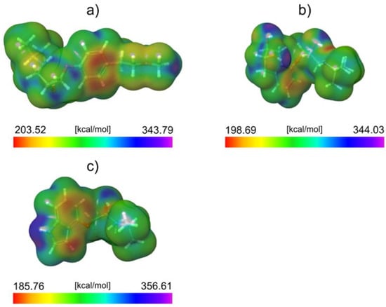 To explain the observed difference in degradation efficiencies, we performed a computational analysis of all molecules in the framework of the DFT approach. Since the degradation efficiency generally depends on the reactivity of molecules and photophysical properties of the catalyst, we decided to compare the reactivity of considered molecules by calculating the average local ionization energy (ALIE), a well-known quantum molecular descriptor. The analysis of the ALIE quantum-molecular descriptor precisely identifies the PIN molecule as the most reactive of all three considered, see Figure 11.