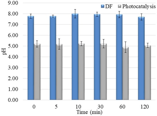 In addition to the fact that it is necessary to overlap at least partially the radiation spectrum and the compounds that DF decomposes, the pH of the solution plays a vital role in the creation of reactive oxygen species and the further interaction of released ions and radicals. The pH value of the aqueous solutions for DF was about 7.5 ± 1.0 (Figure 10). At the specified pH value of the aqueous solution, reactive oxygen species can be created in the water, contributing to the degradation efficiency.