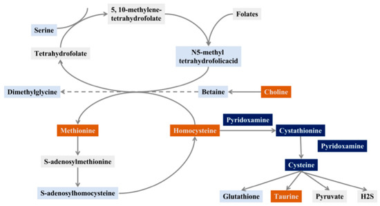 - Stipanuk, M.H.; Ueki, I. Dealing with methionine/homocysteine sulfur: Cysteine metabolism to taurine and inorganic sulfur. J. Inherit. Metab. Dis. 2011, 34, 17–32. [Google Scholar] [CrossRef]