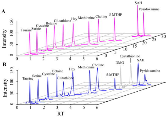 EIC plots of standards and samples detected by LC-QTOF-MS ((A). Standards, (B). Samples). The metabolites shown from left to right are taurine, serine, cysteine, betaine, glutathione, Hcy, Methionine, choline, 5-MTHF, DMG, cystathionine, SAH, pyridoxamine. The metabolites marked in gray are those determined by the MS/MS information.