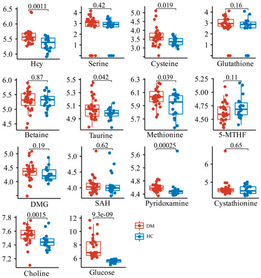 To explore the differences in the relative contents of these metabolites between the HC and DM groups, Kruskal–Wallis and T tests were performed between HC and DM groups. The data showed that the content of Hcy, as well as its downstream metabolites including taurine, cysteine, and pyridoxamine, was significantly increased in the DM group, while the methionine and choline in the folate cycle and methionine cycle were also significantly increased (Figure 3). There were no significant changes in other metabolites related to Hcy synthesis and metabolism.