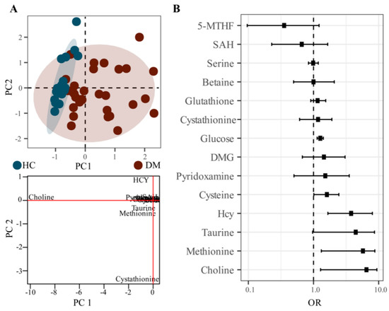 To identify the metabolic characteristics of DM, probabilistic principal component analysis (PPCA) was performed on the metabolite analysis; 13 differential metabolites were identified in the DM group compared with the HC group (Figure 4A). Notably, we found that the Hcy, choline, cystathionine, methionine, and taurine had larger loading values in PC1 or PC2 components and contributed significantly to the PPCA model, suggesting that these metabolites were important variables to distinguish the DM group from the HC group (Figure 4A).