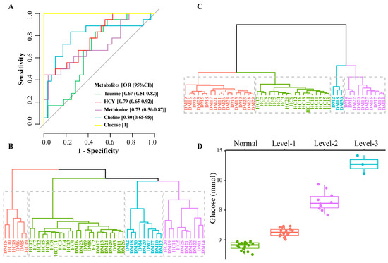 ROC analysis, k-means cluster analysis, and blood glucose distribution corresponding to the clustering results ((A). ROC analysis, (B). Sample clustering results using all 13 metabolites; 4 clusters (colored and boxed) were identified and HC samples cannot be distinguished from DM samples, (C). Sample clustering results based on 4 metabolites; 4 clusters (colored and boxed) were identified and HC samples are in one category, (D). Clustering results corresponding to blood glucose distribution).