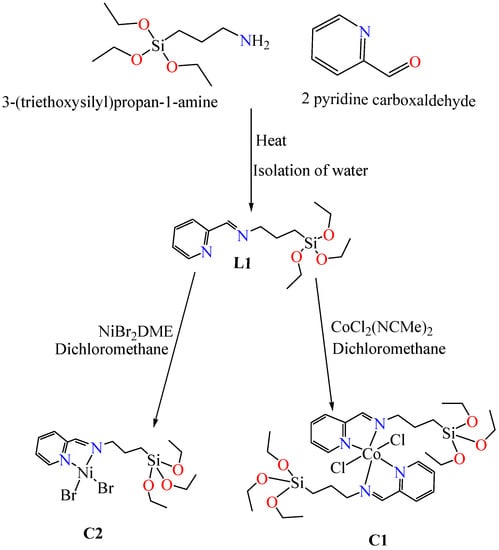 3.2. Synthesis of (E)-1-(Pyridin-2-yl)-N-(3-(triethoxysilyl)propyl) Methanimino Cobalt Chloride (C1)