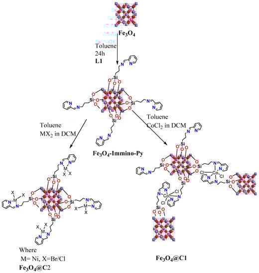 Sejie, F.P.; Oyetunji, O.A.; Darkwa, J.; Beas, I.N.; Makhubela, B.C.E.; Dzade, N.Y.; de Leeuw, N.H. The Transfer Hydrogenation of Cinnamaldehyde Using Homogeneous Cobalt(II) and Nickel(II) (E)-1-(Pyridin-2-yl)-N-(3-(triethoxysilyl)propyl)methanimine and the Complexes Anchored on Fe3O4 Support as Pre-Catalysts: An Experimental and In Silico Approach. Molecules 2023, 28, 659. https://doi.org/10.3390/molecules28020659