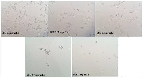 Figure 2. Microscopic observation of struvite crystals at different concentrations of ethanolic extracts of S. costus.