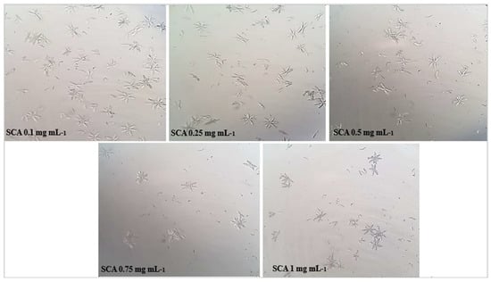 Figure 3. Microscopic observation of struvite crystals at different concentrations of aqueous extracts of S. costus.