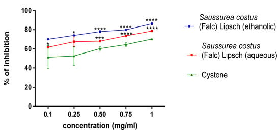 The percentage inhibition of struvite crystals of the aqueous and ethanolic extracts of the plant studied at different concentrations (0.1; 0.25; 0.5; 0.75; 1 mg mL−1) was determined using the turbidimetric method with cystone as a positive control. Data analysis from the curves in Figure 5 revealed that the ethanolic extract of S. costus inhibited struvite crystals more effectively than the aqueous extract of the same plant. In addition, the highest crystal inhibition ratio was (87.447 ± 1.107) (p < 0.001) and (78.565 ± 0.422) (p < 0.001) at a 1 mg/mL concentration for ethanolic and aqueous extracts of S. costus, respectively.