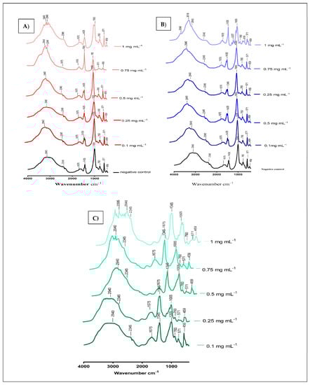 The results displayed in (Figure 5) indicated that the S. costus ethanolic extract of was able to treat struvite crystals and had a significant effect with an inhibition percentage f (87.447 ± 1.107) (p < 0.001) at the concentration of 1 mg mL−1. Regarding the turbidimetric test results of the synthesized struvite crystals, the chemical composition of the crystals was identified using the Fourier transform infrared spectroscopy (FT-IR) technique. The analysis of FT-IR spectra showed (Figure 6) the presence of a band at 2940 cm−1, attributed to the antisymmetric stretching band of ammonium (vs. (NH4)) and the symmetric stretching band of amines (vs. (N-H)) observed at 1675 cm−1. The P=O stretching absorption bands were observed at 760 cm−1, the PO4 absorption band was observed at 1005 cm−1, the antisymmetric stretching band of primary amines (vas (PO4)) was observed at 571 cm−1, and the symmetric absorption band (vas(H-O-H)) was observed at 2345 cm−1 [22,23]. The FT-IR spectrum analysis proved that the compound type is struvite for the negative control. Moreover, the different infrared spectra obtained when processing the crystals at different concentrations show the same bands as the negative control but with a change in the intensity of the peaks, which shows that the active molecules present in these extracts have an effect that can deform or degrade the bonds of the struvite atoms, and this is also shown in Figure 2, Figure 3 and Figure 4, where it was observed that when the concentration of plants increases, the number of crystals decreases, their size changes, and they break.
