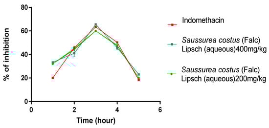 The obtained data for the influence of the S. costus extracts (aqueous) on carrageenan-induced edema are displayed in Figure 7. Both extracts (ethanolic and aqueous) of S. costus at 200 and 400 mg kg−1, administered orally, showed significant (p < 0.05) anti-inflammatory activity compared to the standard indomethacin.