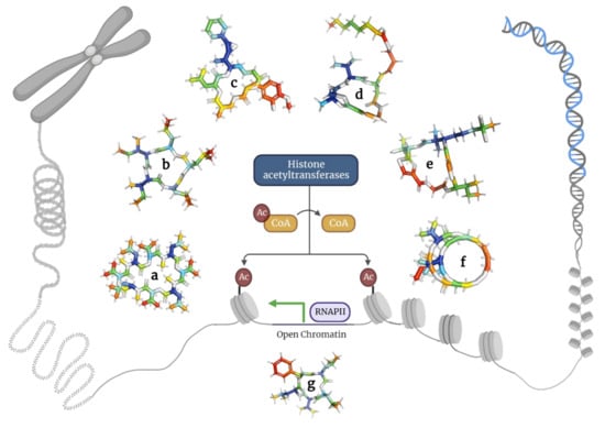 Histone deacetylases constitute a group of enzymes catalyzing the deacetylation of lysine residues found in histones and other proteins [106]. The acetylation of these residues results in a less condensed chromatin structure due to increased space between the nucleosome and DNA, thus modulating cell cycle progression [107]. Interestingly, histone deacetylase inhibitors can induce apoptosis, delay cell cycle progression, and inhibit cancer cell differentiation [30].