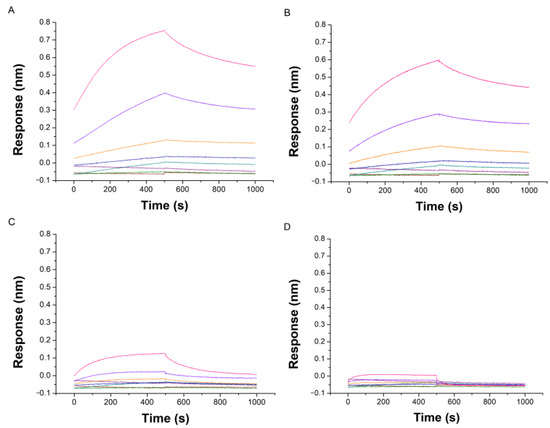 The interaction was first studied by using BLI. For this purpose, the different oligonucleotide sequences (Table 1) were biotinylated at their 3’-termini and anchored on the BLI sensors through biotin-streptavidin interactions. The sensors were next dipped into the solutions containing IMC-48 at concentrations ranging from 100 nM to 100 µM. The sensors were not regenerated after each measurement and the obtained sensorgrams are depicted in Figure 3 and Figure 4 for pH 5.5 and pH 7.5, respectively. As shown in Figure 3B, IMC-48 binds the bcl-2 sequence in its folded form, as evidenced by the dose-dependent increase of the BLI response, which is in agreement with the previously reported results [20]. However, a visual observation clearly indicates that the affinity is far from the reported ~500 nM KD value. Indeed, the signals start to increase at a concentration between 10 and 25 µM (black and orange sensorgrams, respectively, in Figure 3B). Below these concentrations, the response is quasi-null. It should be noted that IMC-48 also interacts with HRAS at similar concentrations (Figure 3A), whereas it does not bind Htelo-C and c-myc sequences in the tested concentration range (from 0.1 to 100 µM). The weak interaction observed with bcl-2 and HRAS i-motif structures may be attributed to the formation of hairpins by these sequences, presumably acting as weak ligand binding sites, but we have not investigated it. It should be noted that the shape and the amplitude of the sensorgrams does not allow an exact determination of the KD values (examination of the Langmuir analyses in Figure S15 in the supporting information shows that the plateau value is not reached at the studied concentration). With regard to Figure 4A,B, the KD value could be estimated for the HRAS and bcl-2 sequences, superior to 50 µM.