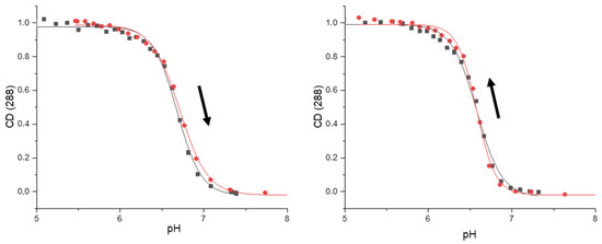 Representative pH-dependent denaturation/renaturation of i-DNA: normalized changes of ellipticity at 285 nm in the course of potentiometric titrations of bcl-2 performed in the absence (black points and curves) and in the presence (red points and curves) of 20 µM IMC-48. For the detailed conditions, cf. Table 2 legend. (Left) alkali (denaturing) titration; (right) acid (renaturing) titration. The arrows indicate the denaturing/renaturing processes.