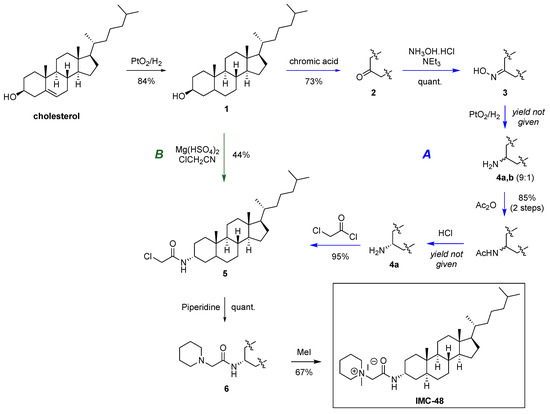 The previously reported synthesis of IMC-48 (Scheme 1A, blue arrows) started by the reduction of cholesterol into cholestanol 1 using platinum oxide under hydrogen atmosphere [27]. Cholestanol 1 was then oxidized by chromic acid into cholestanone 2, which was further transformed into cholestanone oxime 3. The subsequent reduction of the oxime using platinum oxide under an hydrogen atmosphere afforded a 9/1 mixture of 3α- and 3β-aminocholestanes 4a,b. This mixture was next acetylated in order to separate the diastereoisomers by alumina column chromatography. After deprotection, 3α-aminocholestane 4a was reacted with chloroacetyl chloride to provide the key intermediate, chloroacetylaminocholestane 5. The substitution of the chlorine atom by piperidine gave piperidinoacetylaminocholestane 6, which was methylated with methyl iodide to afford IMC-48. In this initial report, the steps from aminocholestane 4 to IMC-48 were mentioned, but without experimental details and no state-of-the-art compound characterization data. In particular, no experimental details regarding the reduction of cholestanone oxime 3 into aminocholestane 4 were provided. As attempts to reproduce this synthesis failed to give reliable results, we were motivated to develop a shorter and more convenient synthesis of the key intermediate, chloroacetylaminocholestane 5.