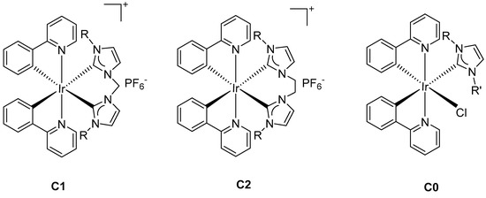 The three designed families of cyclometalated iridium(III) NHC complexes involving ppy C^N ligands and bearing different NHC ligands are represented in Figure 1. The first two families contain a bis-carbene ligand, in which the two NHCs are bridged by a methylene (C1) and an ethylene (C2), giving rise to cationic complexes, while the other one (C0) contains only one mono-carbene ligand and one chloride, leading to a neural complex. The NHC ligands contain aliphatic or aromatic groups.