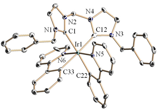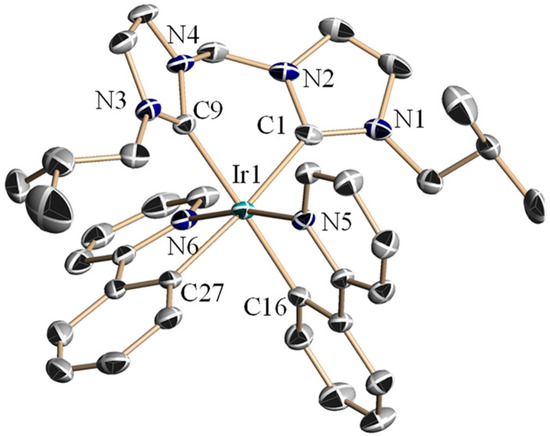 All the presented iridium structures (Figure 2, Figure 3, Figure 4, Figure 5 and Figure 6) show some common features: the iridium atom is coordinated by a bis-NHC ligand and two phenylpyridine ligands, and the four carbon atoms and the two nitrogen atoms linked to iridium form a distorted octahedral geometry. It is notable that the carbene carbon atoms are in trans positions to the deprotonated carbon atoms of the ppy ligands and the two nitrogen atoms are in all cases also in trans positions related to the central iridium. The Ir-C(carbene) distances are in the range of 2.09 and 2.16 Å. The Ir-C distances (2.04 to 2.07 Å) and the Ir-N distances (2.03 to 2.07) of the ppy ligands are nearly the same in all cases. The ppy ligands show in all complexes very similar N-Ir-C bite angles between 78.8 and 80.4°. Only one remarkable difference could be observed for the bis-NHC systems. The C-Ir-C angles in the C1 ligands is between 83.9 and 84.6°, while it is much more open for the C2 ligands with angles between 95.4 and 96.6°, a significant difference of about 10° between the C1 and the C2 systems.