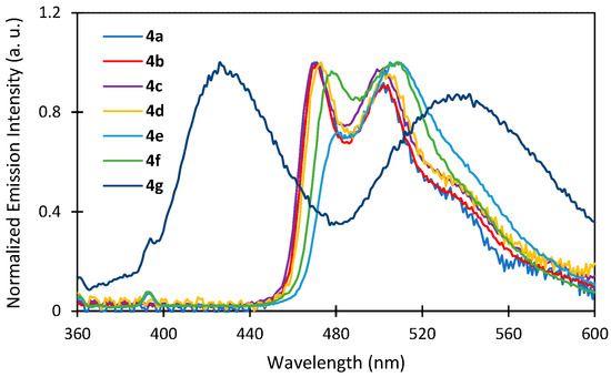 The luminescence spectra of complexes 4a to 4f in CH2Cl2 at 298 K are shown in Figure 8 and their photophysical data are summarized in Table 1. After excitation at 360 nm, all the complexes, except 4g, showed similar blue–green emission, with two maximum wavelengths around 470 and 500 nm, respectively. The neutral iridium complex 4g displayed a dual blue and green emission, with two maxima at 425 nm and 535 nm. All the complexes showed vibronically structured phosphorescence spectra in the CH2Cl2 solution at room temperature, which indicated that the emissive excited state had both LC π→π* and MLCT characters [72].
