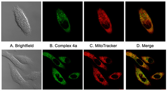 The intracellular localization of complex 4a was studied by confocal laser scanning microscopy. The treatment of PC-3 (human prostate) cells with complex 4a led to the development of intense fluorescence in the cytoplasm (Figure 9B). Specific subcellular location was investigated by staining the organelles with the specific fluorescent probe MitoTracker Deep Red (Figure 9C). As shown in Figure 9D, complex 4a localized mainly to the mitochondria with a Pearson colocalization coefficient value of 88%. However, an accumulation of complex 4a in lysosomes or the endoplasmic reticulum cannot be excluded. Taken together, and based on the photophysical data, these results show that the C1 series of iridium complexes have potential as mitochondria-targeting agents.