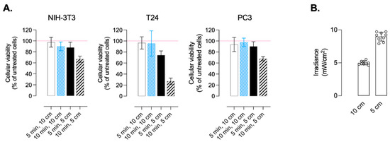 To ascertain that irradiation conditions did not per se affect cell viability, NIH-3T3, T24 and PC-3 cells were irradiated or not at 458 nm for different times (5 and 10 min) at different distances between the cell layer and the light source (5 and 10 cm). Cell viability was measured after 72 h of incubation. A minimal toxicity was observed for a distance of 10 cm between the light source and the cells, with no significant difference in toxicity between 5 or 10 min of irradiation (Figure 10A). Based on these results, all further experiments were conducted with the following irradiation conditions: 10 min of irradiation at a distance of 10 cm. As shown in Figure 10B, under these conditions, the measured irradiance was 5.0 mW/cm2 after the illumination of 48-well cell culture plates.
