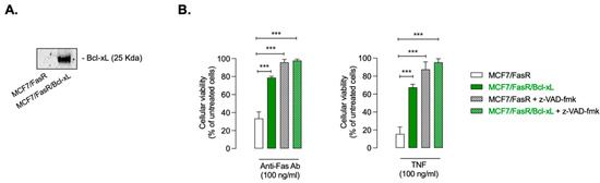 Bcl-xL and z-VAD-fmk inhibited by Fas- or TNFα-induced cell death in MCF7 cells. (A) Cellular proteins from MCF7/FasR and MCF7/FasR/Bcl-xL cells were separated by SDS-PAGE and immunoblotted using anti-Bcl-xL antibody. (B) MCF7/FasR and MCF7/FasR/Bcl-xL treated with 100 ng/mL anti-Fas or 100 ng/mL TNFα for 72 h in presence or in absence of 10 µM pan-caspase inhibitor z-VAD-fmk. Cell death was assessed by MTT assay. Results are means ± SD of 3 independent experiments (***, p < 0.0001).
