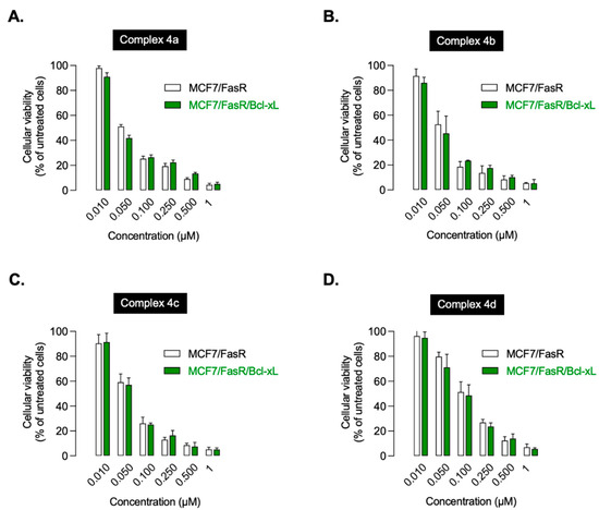 Mitochondrial outer membrane permeabilization (MOMP), which leads to rapid cell death through the release of mitochondrial proteins (including cytochrome c) that activate executioner caspases, is the critical event in intrinsic apoptosis [79]. This is an irreversible event, which can only be antagonized by the anti-apoptotic members of the Bcl-2 family, including Bcl-xL, the only anti-apoptotic Bcl-2 member exclusively associated to the mitochondrial outer membrane [80]. We then assessed whether the cell death induced by our complexes could be abrogated by the overexpression of Bcl-xL. As shown in Figure 12, the effects of complexes 4a to 4d with respect to loss of cell viability were not affected by Bcl-xL, regardless of the drug concentration used (from 10 nM to 1 µM), suggesting that cell death induced by our complexes is not based on a Bcl-xL-dependent mitochondrial mechanism.