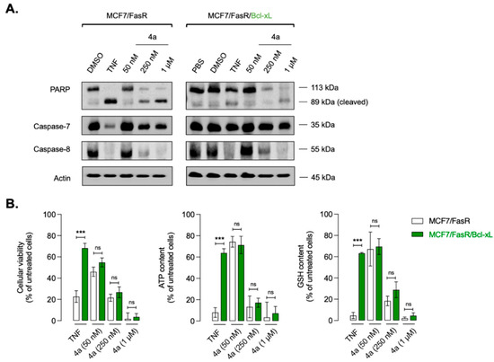 Evaluation of apoptotic biomarkers. MCF7/FasR and MCF7/FasR/Bcl-xL cells were irradiated at 458 nm in presence of the indicated concentration of complex 4a or treated with 100 n/mL TNFα for 72 h. (A) Cytosolic extracts from MCF7/FasR and MCF7/FasR/Bcl-xL cells were separated by SDS-PAGE and probed with anti-PARP, anti-caspase-7 and anti-caspase-8. Migrations indicated are: full-length PARP p113, cleaved PARP p89, full-length caspase-7 and full-length caspase-8. (B) MTT, ATP and GSH assays were evaluated in duplicate samples. Data are expressed as percent (%) of untreated cells and are the means of 3 independent experiments (***, p < 0.0001, NS, not significant).