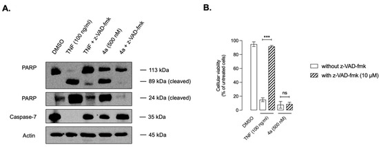 Collectively, the data shown in Figure 13 and Figure 14 suggest activation of an unexpected extrinsic (mitochondria-independent) apoptotic signaling (caspase-8/caspase-7/PARP), with a high concentration of complex 4a (5- to 20-fold the GI50 concentration). As anticipated, while this sequential activation of caspases cannot be blocked by Bcl-xL, treatment with z-VAD-fmk is able to completely block this extrinsic apoptotic signaling. Such activation of the extrinsic apoptotic signaling might be the consequence of a bystander effect of necrotic dying cells that could release factors activating the TNF superfamily of receptors, leading to caspase-8 activation, and subsequent activation of caspase-7, leading to PARP cleavage. Alternatively, it could also be a consequence of a potential feedback amplification of upstream apoptosis signaling directly via caspase-8 activation independently of TNF/TNF receptor family members’ interaction. Importantly, regardless of the mechanism of action leading to caspase-8 activation, z-VAD-fmk, while blocking the activation of this signaling pathway, did not have any effect on cell viability, suggesting a futile activation of apoptosis signaling driven by caspase-8 and not a major determinant of the behavior of complex 4a-exposed cells, which has been reported in the past with DNA damaging agents [84].