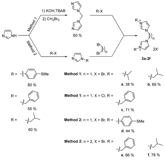 The bis(imidazolium) salts 3a to 3f were synthesized by two different methods (Scheme 1). Method 1: Firstly, 1,1′-methylene bis(1H-imidazole) was prepared using a modified literature procedure, with a yield of 60% [65,66]. It was then reacted with 2.2 equivalents of an alkyl halide, 2-bromopropane (a) or 1-bromo-2-methylpropane (b) under reflux for 48 h and benzyl chloride (c) in CH3CN under reflux for 10 h, respectively, to afford the carbene precursors 3a–3c with yields ranging from 38% to 71%. Method 2: Mono-substituted imidazoles were readily obtained by N-alkylation of imidazole with 4-bromo-thioanisole (d) in the presence of K2CO3 and a catalytic amount of CuSO4 at 205 °C for 10 h, benzyl chloride (e) in the presence of K2CO3 in DMF at 50 °C for 2 h and isobutyl bromide (f) in the presence of KOH in DMSO at room temperature for 2 h, with yields ranging from 55% to 80%. These substituted imidazoles were then reacted with an excess of dibromomethane under reflux for 10 h (3d), dibromoethane in toluene under reflux for 24 h (3e) or dibromoethane at 110 °C for 72 h (3f), to give the desired proligands 3d–3f with yields ranging from 44% to 78% for this second step.