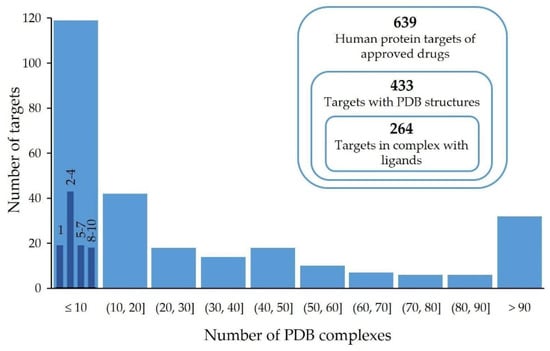 Distribution of the number of human targets per number of PDB protein–ligand complexes in the analyzed set of 264 proteins from the pharmacolome. For the first gross interval [1, 10), a distribution in smaller intervals (1, 2–4, 5–7 and 8–10) is shown in dark blue bars.