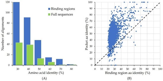 (A) Distribution of aa identity percent in the BLAST sequence alignments obtained for the Histoplasma capsulatum proteome, using as input either the full sequences (green bars) or the binding region sequences (blue bars) for the selected 264 proteins from the human pharmacolome. (B) Scatter plot showing the higher similarity between human and fungal binding pockets, as compared with the similarity between the binding region sequences that encompass the binding pocket amino acids.