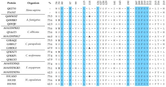 Alignment of the binding pocket residues for the non-ATP competitive site of MEK1/2 (Q02750 and P36507), with the corresponding residues in the identified fungal proteins having similar binding pockets, for the six analyzed species. The third column in the table shows the calculated aa identity percentages for the set of binding pocket residues. Fully conserved positions are highlighted in blue; non-conservative substitutions at positions 79 and 118 are marked in bold.
