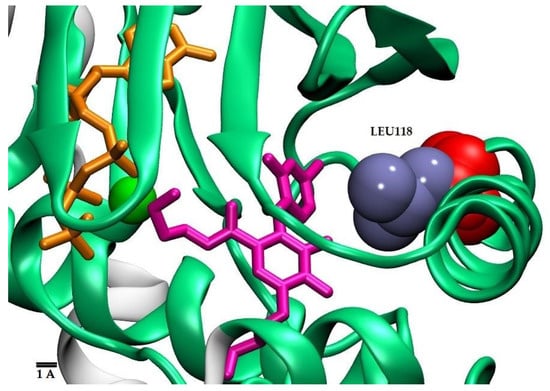 Structure of the MEK1/2 binding site showing the Leu 118 side chain (in blue spheres). Mutation of this residue by Glycine (in red spheres) creates a void space that can be occupied by atoms of fitting compounds.