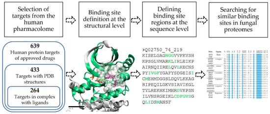 Briefly, we employed a structural approach to identify binding site similarities, taking advantage of the thousands of available crystal structures for proteins of the human pharmacolome, many of them in complex with inhibitors. As explained in detail in the following sections, we used these bound inhibitors as anchors to define the binding site amino acids for each human target, followed by local sequence searches and analyses against the proteomes of several fungal species. The workflow is represented in Figure 6.