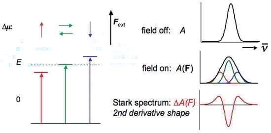 The simplified explanation in physical terms is that the random orientations of in relation to the direction of the applied EEF lead to changes in the energy levels of the transition state and, accordingly, to broadening the spectrum of the transition. Mathematical modelling of the Stark effect shows a spectral shape, similar to a second derivative curve (Figure 1), which results from the difference between the filed-on and field-off spectrum. When interacting with the field, the molecular polarizability ∆α changes, causing a dipole moment, usually in the direction of the field. Since this field-induced dipole moment is field-oriented, the spectrum shifts to either higher or lower energy, depending on the sign of . This shift gives a shape, which could be associated with the first derivative of the absorption spectrum. The origin of these observed effects with respect to the absorption spectra can be understood by considering a hypothetical example of a molecular ensemble characterized only by two energy levels. The influence of the EEF applied parallel or in the opposite direction of the dipole moment is shown in Figure 1.