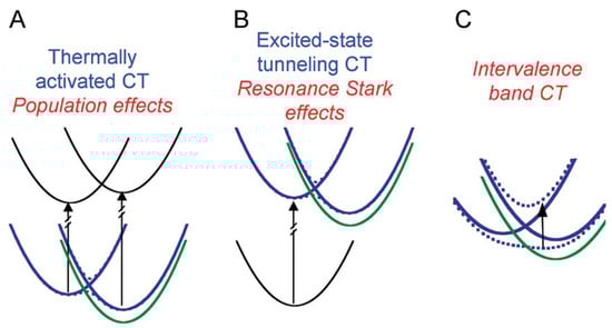 Scheme of the energy level diagrams showing three types of the so-called nonclassical Stark effects in which the absorption or emission line shape is affected. All levels in blue correspond to absence of the applied field, while in green the shift in level for orientation of the field is given. (A). Application of the field, for population effects, shifts one of the states to lower energy and so the populations are supposed to respond as the system returns to equilibrium. (B) A similar effect is expected to occur for excited-state electron transfer. The rate of electron transfer is changed as the charge-separated-state energy is shifted by the field change. Because of the mixing of the locally excited and charge-separated state, the ground-state is also affected by the electric fields, which leads to “resonance Stark effects”. (C) The direct transfer of an electron from one part of a molecule to another corresponds to intervalence charge transfer bands. Theoretical investigations, such as [33,34], can be used as a description for the intensity, position, and line width of these transitions. It is expected that an application of a field will shift the relative energy of the states involved in the transition and will lead to intervalence band Stark effect line shapes. Reprinted with permission from [30]: Copyright 2009 American Chemical Society.