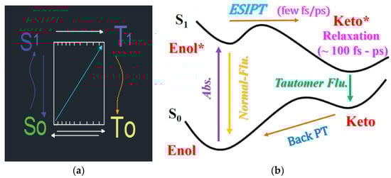 Sketch of a tautomer process (a) with contribution of ground and excited states (S0, S1, T0 and T1 represent ground and excited states of enol- and keto- forms, respectively); a closed four-level-cycle process of proton transfer (b) of a tautomeric compound. Reprinted from [66]: Copyright (2020), with permission from Elsevier.