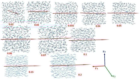 As an example, some snapshots in the MD trajectories of the dipole moments and global dipole moments (red arrows) for different values are shown in Figure 5. As seen, the solvent alignment increases with an increasing strength of while the global dipole moments gradually align with the field along the X axis. At around almost all CH3CN molecules and the global dipole moment are aligned.