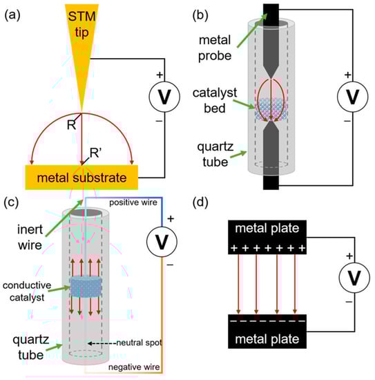 The effects of non-electrochemical activation of chemical reactions by using EEF have been exanimated as well. In 2018, Che et al. [59] distinguished between internal and external electric fields in the absence or presence of an applied electrical potential. They defined an EEF by utilization of an external power source to create the required surface electric field over the catalytically (or tautomerization) active zone, mostly metal surface. In their study different empirical approaches have been considered, namely (Figure 6) the use of scanning tunneling microscope (STM) probe nanoreactors, probe−bed−probe (PBP) reactors, integrated circuit reactors or capacitor reactors.
