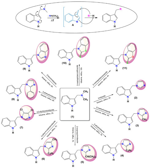 To obtain C-3 substituted indole derivatives, gramine was used as a substrate with a good leaving group leading to a vinylogous intermediate [A]. The reaction of [A] with appropriate imidazole compounds (imidazole, 2-methylimidazole, 2-ethylimidazole, 2-isopropylimidazole, 2-ethyl-4-methylimidazole, 2,5-dichloroimidazole, 2-phenylimidazole, 2-benzimidazole), 2-mercaptobenzothiazole or 2-mercaptobenzoxazole gives compounds 2–11 (Figure 2).