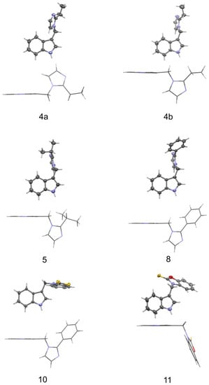 The structures of the molecules, as seen in the crystals of compounds 4 (two symmetry independent molecules), 5, 8, 10, and 11, are shown in Figure 3. The main skeleton can be described as consisting of two methylene bridged subunits, each containing aromatic rings which are inclined with respect to each other at angles varying from 66.40(4) to 84.20(3)°. One of the fragments is always a planar indole moiety, while the other is either 2-substituted imidazole (4, 5, 8) or a planar benzothiazole-2-thione (10) or benzoxazole-2-thione (11). In molecules 4, 5, and 8, the indole part forms an angle of 62.7(2), 63.6(2), 65.6(1), and 61.4(1)° with a plane containing C-C and C-N bonds to the methylene group (called the methylene plane), while the imidazole fragment is inclined to this plane at only 10.3(1), 13.2(1), 31.3(2) and 28.0(2)°.