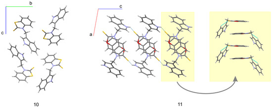 The molecular conformation markedly changes with the replacement of imidazole fragments by either benzothiazole-2-thione (10) or benzoxazole-2-thione (11). While in the imidazole derivatives (4, 5, and 8), the imidazole ring lies almost in the methylene plane, and the indole fragment is significantly out of this plane, in 10, on the contrary, the indole ring is close to the methylene plane while the benzothiazole-2-thione moiety is out of this plane, the corresponding angles being 13.4(3) and 78.2(1)°. Such conformation is particularly well suited for the formation of an intramolecular hydrogen bond from the methylene C-H donor to the S=C acceptor. The C···S and H···S distances are 3.140(3) and 2.69 Å, and the C-H···S angle amounts to 109°. In 11 both rings are nearly perpendicular to the methylene plane and form angles of 89.7(1) and 80.8(1)° with this plane. This conformation is exceptional for the investigated series and is less favorable for the formation of C-H···S intramolecular hydrogen bond. As follows from the above, the molecules of 10 and 11 differ in conformation not only with respect to the other molecules in the series studied but also between each other (although the chemical difference between them arises solely from the chalcogen exchange). The observed significant alteration of the molecular conformation in the solid state caused by the S/O replacement has far reaching consequences with respect to intermolecular interactions. While in the crystals of 10 the donor N-H group is engaged in intermolecular N-H···π interactions to the benzene part of the indole ring (Table 2), in the crystals of 11 we observe N-H···S=C hydrogen bonds joining the molecules along c-direction (Table 2) and columnar stacking interactions between benzoxazole-2-thione fragments, related by the two-fold screw axis along b-direction (Figure 4). The distance between the centroids of the two fragments in a stack amounts to 3.658 Å, while the distance between their planes is 3.603 Å (symmetry code –x + 1, y + 1/2, −z + 1/2). The planes are nearly parallel, the interplanar angle being 10° and the displacement of the rings in a stack is only 0.399 Å.