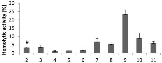 Hemolytic activity of compounds 2–11 at a concentration of 0.1 mg/mL. Results (n = 7) are presented as the mean value ± standard deviation. # Data published in [18].