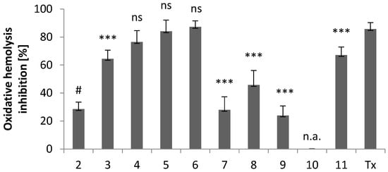 Cytoprotective activity of compounds 2–11 and the standard antioxidant Trolox against oxidative hemolysis induced by free radicals generated from AAPH. The results (n = 7) are presented as the mean value ± standard deviation (*** p < 0.001) in comparison with the standard antioxidant Trolox. Non statistically significant difference (p > 0.05) is indicated as ns. Inactive compounds are indicated as n.a. # Data published in [18].