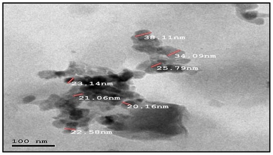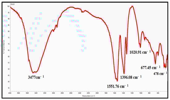 As Figure 3 shows, there was a broad band at 3477 cm−1 corresponding to the hydroxyl group of the water molecule on the surface of the ZnO nanoparticle. The band at 1551 cm−1 is due to an OH bend to ZnO. A strong band at 478 cm−1 was also attributed to Zn-O. XRD patterns of ZnO nanoparticles are shown in Figure 4. The peaks at 2 θ = 31.746, 34.395, 36.226, 47.526, 56.549, 62.832, 67.893, and 69.028 were assigned to (100), (002), (101), (110), (103), (200), (112), and (201) of ZnO nanoparticles. All peaks indicated a hexagon Wurtzite structure (Zincite, JCPDS no.: 89-0510). No characteristic peaks of any impurities were detected, demonstrating the high quality of the ZnO nanoparticle. The SEM image in Figure 5 displayed the well-defined shape of zinc oxide nanoparticles with a smooth surface. Furthermore, the TEM image (Figure 6) showed that the morphology and shape were like rods, and its size was estimated at 25–30 nm.